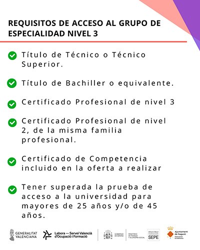 Per al Grup 1 no és necessari tindre formació prèvia. No obstant això, per al Grup 2 és requisit estar en possessió d'alguna de les següents titulacions: títol de Tècnic o Tècnic Superior, Títol de Batxiller o equivalent, certificat de Professional nivell 3, certificat de professionalitat de la mateixa família o àrea professional de nivell 2, certificat de Competències clau nivell 3, complir el requisit d'accés a cicles formatius de grau superior o les corresponents proves d'accés, o tindre superada la prova d'accés a la universitat per a majors de 25 anys i/o 45 anys.