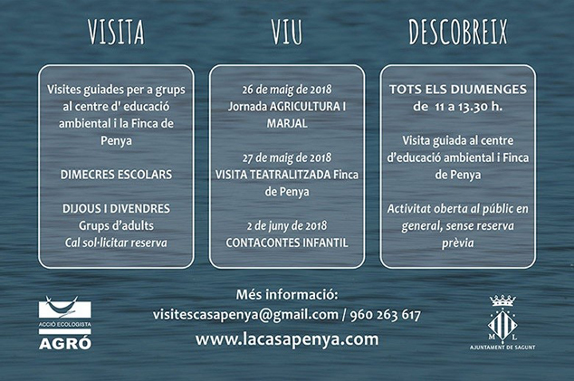 L'Ajuntament de Sagunt i Acció Ecologista-Agró presenten la nova programació de les activitats que es duran a terme durant la primavera. L'objectiu principal i el lema que engloba a les pròximes cites del calendari és ‘Vine, viu i descobrix La Casa Penya’.