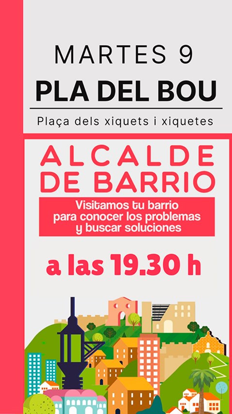 La iniciativa Alcalde de Barri, impulsada pel departament de Participació Ciutadana i l'Alcaldia de l'Ajuntament de Sagunt, visitarà este dimarts, 9 d'agost, a les 19.30 hores el Pla del Bou.