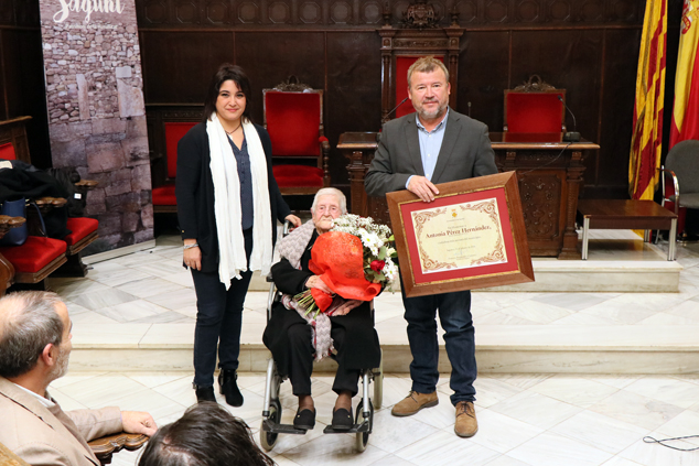 L'Ajuntament de Sagunt ha retut hui homenatge a Antonia Pérez Hernández. Als seus 106 anys, Antonia viu en el carrer La Pau, i hui, envoltada dels seus familiars i amics, que es compten fins a 40, l'han rebuda l'alcalde de Sagunt, Quico Fernández, i la delegada de Majors, Natalia Antonino.