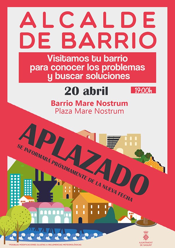 L'Ajuntament de Sagunt informa que la trobada de la iniciativa Alcalde de Barri prevista per a este dimecres a la vesprada en la plaça Mare Nostrum s'ajorna fins a altre avís a causa de les males condicions meteorològiques.