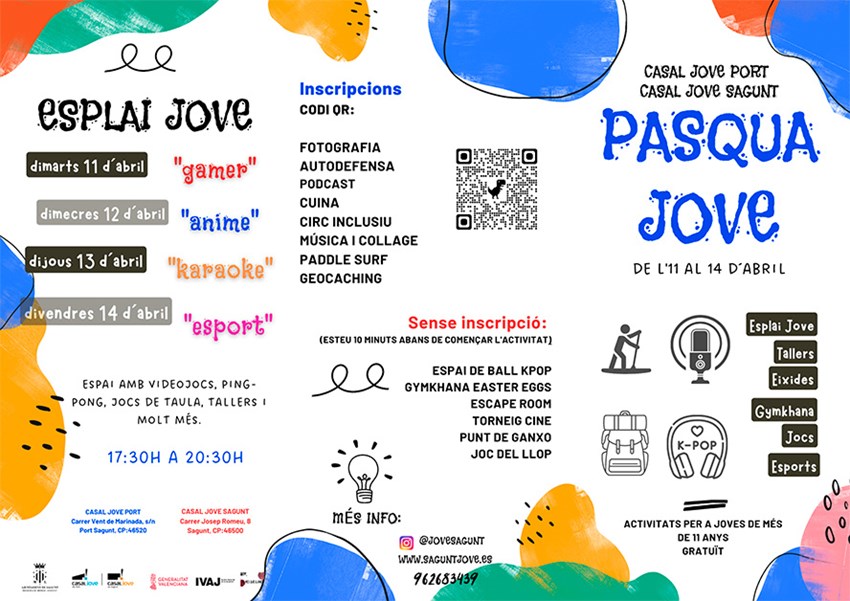 La inscripció d'alguns dels tallers ja ha començat a través de la plataforma d'inscripcions en línia de l'Ajuntament de Sagunt https://aytosagunto.apuntate.online/ finalitzant el termini el pròxim 10 d'abril. Per a altres activitats només serà necessari presentar-se 10 minuts abans de l'inici de l'activitat. Totes les activitats són gratuïtes, accessibles i variades per a arribar a tota la població juvenil.