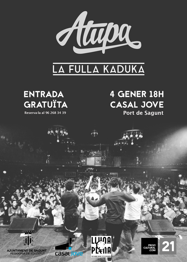 El conjunt local “La Fulla Kaduka” assistix al Casal Jove a presentar el seu primer EP amb el seu particular mestissatge de diferents estils musicals on predominen el jazz, el reggae i el rock. Més tard, i com a cap de cartell, “Atupa”, actuarà per primera vegada a la nostra localitat. “Atupa” és un grup de Montcada que basa el seu estil en el rap amb connexions amb el hardcore, el dubstep, el drum and bass, funk, ska i fins a la cançó d'autor. Amb el seu segon treball, “Expansion Pack”, han intensificat la seua faceta més electrònica sense abandonar el seu  rap original.