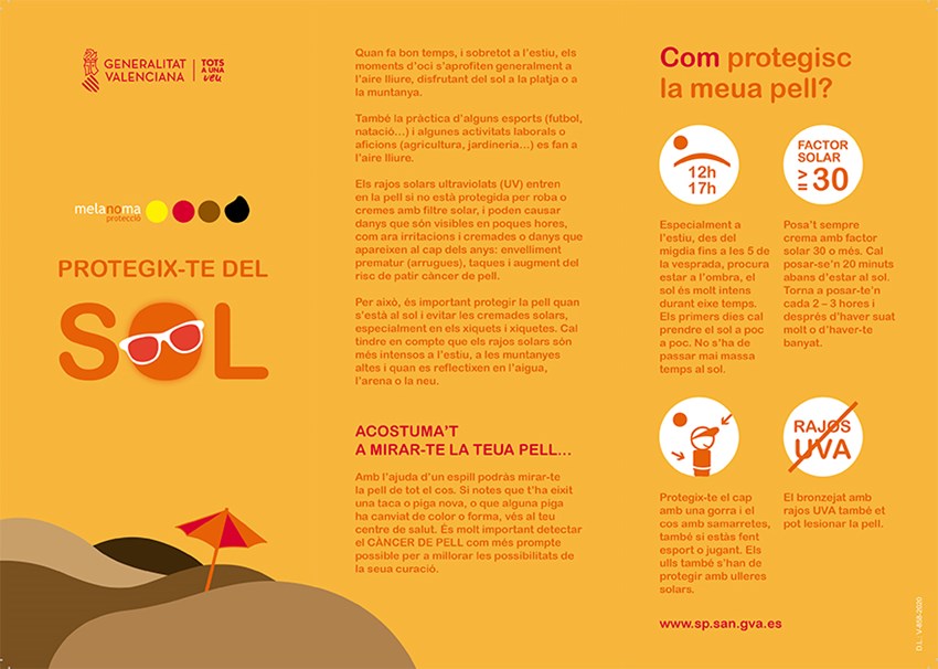 A través d'esta campanya, Sanitat recorda la importància de no exposar-se al sol en horari de 12.00 a 17.00 hores durant l'estiu, protegir la pell amb factor solar 30 o major i protegir el cap amb gorra o el cos amb samarreta durant les activitats esportives. Així mateix, informa sobre la importància de l'autoexploració de la pell per a una detecció precoç del melanoma.