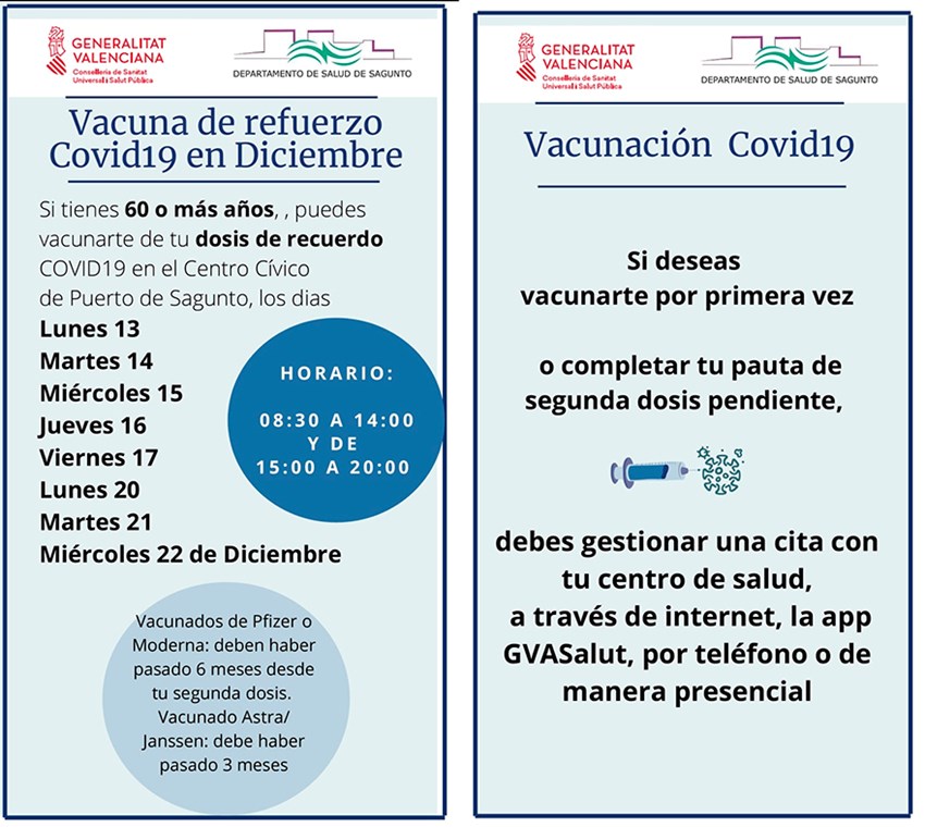La Regidoria de Sanitat de l'Ajuntament de Sagunt, en col·laboració amb el Departament de Salut de Sagunt, informa que a partir del pròxim dilluns, 13 de desembre, es tornarà a obrir el Centre de Vacunació del Centre Cívic Antic Sanatori del Port de Sagunt com a centre de vacunació massiva.
