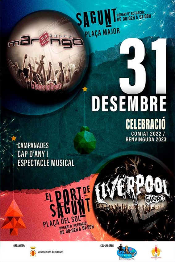 A Sagunt, l’Orquestra Marengo actuarà a la plaça Major des de les 23.30 hores. La cita estarà amenitzada per Paqui Rondán, amb la companyia d’este grup revelació jove i divertit. Les campanades seran des de l’Església de Santa María. L'Orquestra Marengo és un grup que no para de créixer i assegurar-se l'èxit amb components que aporten talent i fort dinamisme sobre l'escenari amb extens repertori musical per a tots els públics.