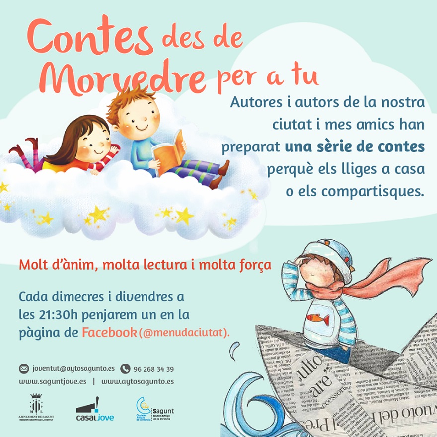 La Regidoria de Joventut i Infància ha llançat una nova proposta per al confinament dirigida a la infància. Com a part de l'activitat del departament per a passar de millor manera esta situació, proposa la iniciativa “Contes des de Morvedre per a tu”, en la qual escriptors i escriptores de Sagunt i de la comarca aniran oferint els seus contes infantils perquè les famílies els puguen llegir i compartir.
