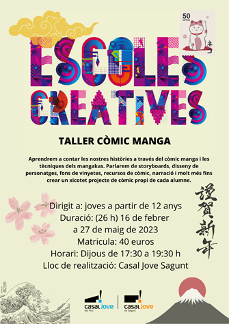 A més, del 16 de febrer al 27 de maig torna la novel·la gràfica amb el taller de còmic manga, que tindrà lloc en el Casal Jove de Sagunt, on els i les jóvens que s'hagen inscrit aprendran a contar les seues històries a través del còmic manga i les tècniques dels mangakas, i on treballaran també les storyboards, el disseny de personatges, els fons de vinyetes, recursos de còmic, narració i molt més fins a crear un xicotet projecte de còmic propi de cada alumne i alumna. Esta activitat tindrà lloc els dijous de 17.30 a 19.30 hores per a jóvens a partir de 12 anys.