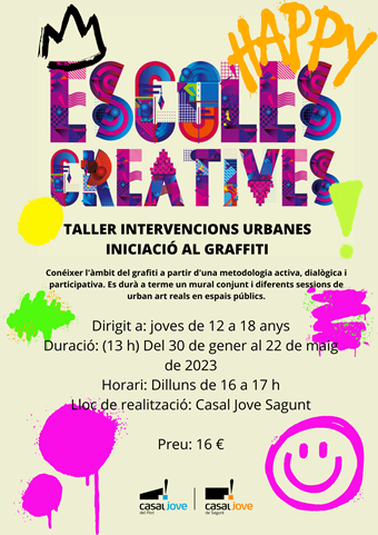 Així mateix, del 30 de gener al 22 de maig es desenvoluparà el taller d'intervencions urbanes i iniciació al grafiti per a jóvens en el Casal Jove de Sagunt, on l'alumnat coneixerà l'àmbit del grafiti a partir d'una metodologia activa, dialògica i participativa i s'elaborarà un mural conjunt i es duran a terme diferents sessions de urban art reals en espais públics. Esta activitat tindrà lloc els dilluns de 16.00 a 17.00 hores per a jóvens entre 12 i 18 anys.