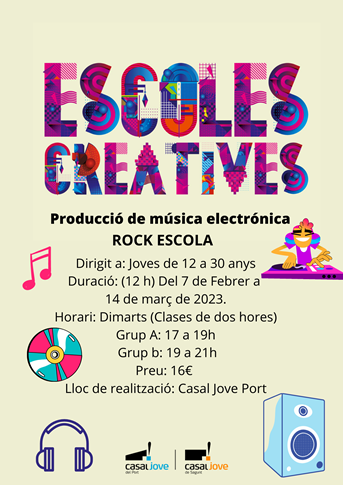 També serà el torn del taller Producció de música electrònica del 7 de febrer al 21 de març els dimarts de 17.00 a 19.00 hores (grup A) i de 19.00 a 21.00 hores (grup B) en el Casal Jove del Port de Sagunt, per a jóvens de 12 a 30 anys.