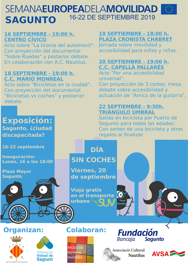 L'Ajuntament de Sagunt, a través de la delegació de Mobilitat Urbana, amb la Federació Veïnal de Sagunt, ha organitzat diferents activitats al voltant de la mobilitat urbana amb la col·laboració de la Fundació Bancaixa Sagunt, de l'Associació Cultural Nautilus i de l'empresa AVSA, així com del Moviment MOUV 18 que engloba a la Federació Veïnal Sagunt, Discamp, Avocam, UDP, ADMPI, Iaio Flautes, Amics de la Guitarra i Dones de Baladre. Una jornada sobre mobilitat i accessibilitat amb xiquets i xiquetes, projeccions de documentals i debats han sigut algunes de les activitats que durant la Setmana Europea de Mobilitat s'han realitzat a Sagunt.
