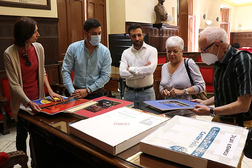 Este matí, l'alcalde de Sagunt, Darío Moreno, i el regidor d'Arxiu i Biblioteques, Roberto Rovira, han rebut a l'Ajuntament a María José Piqueras, qui ha fet lliurament personalment d'algunes de les fotografies de la col·lecció.