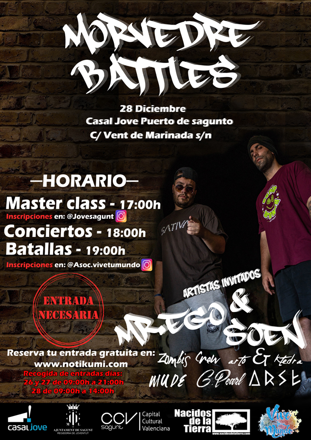 La delegació de Joventut de l'Ajuntament de Sagunt ha organitzat el 28 de desembre en el Casal Jove l'esdeveniment ‘Morvedre Battles’. A les 17 h tindrà lloc una màster class, a les 18 h els concerts i a les 19 h les batalles.
