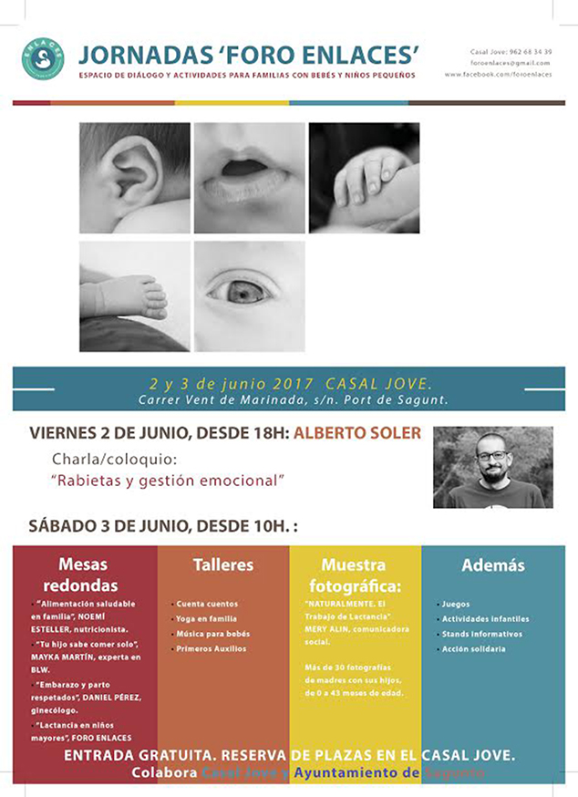 L'Ajuntament de Sagunt, des de la regidoria de Joventut, col·labora en la realització d'estes jornades que començaran divendres 2, a les 18 hores, amb la conferència/col·loqui Rabietas y gestión emocional, impartida pel psicòleg Alberto Soler. Les activitats continuaran dissabte durant tot el matí amb taules redones i tallers. Els temes a tractar són l'alimentació saludable, la lactància, l'embaràs i el part; per la seua banda, els tallers consisteixen en conta-contes, ioga en família, música per a nadons i primers auxilis. Totes les activitats són gratuïtes i cal inscriure’s per a participar-hi.