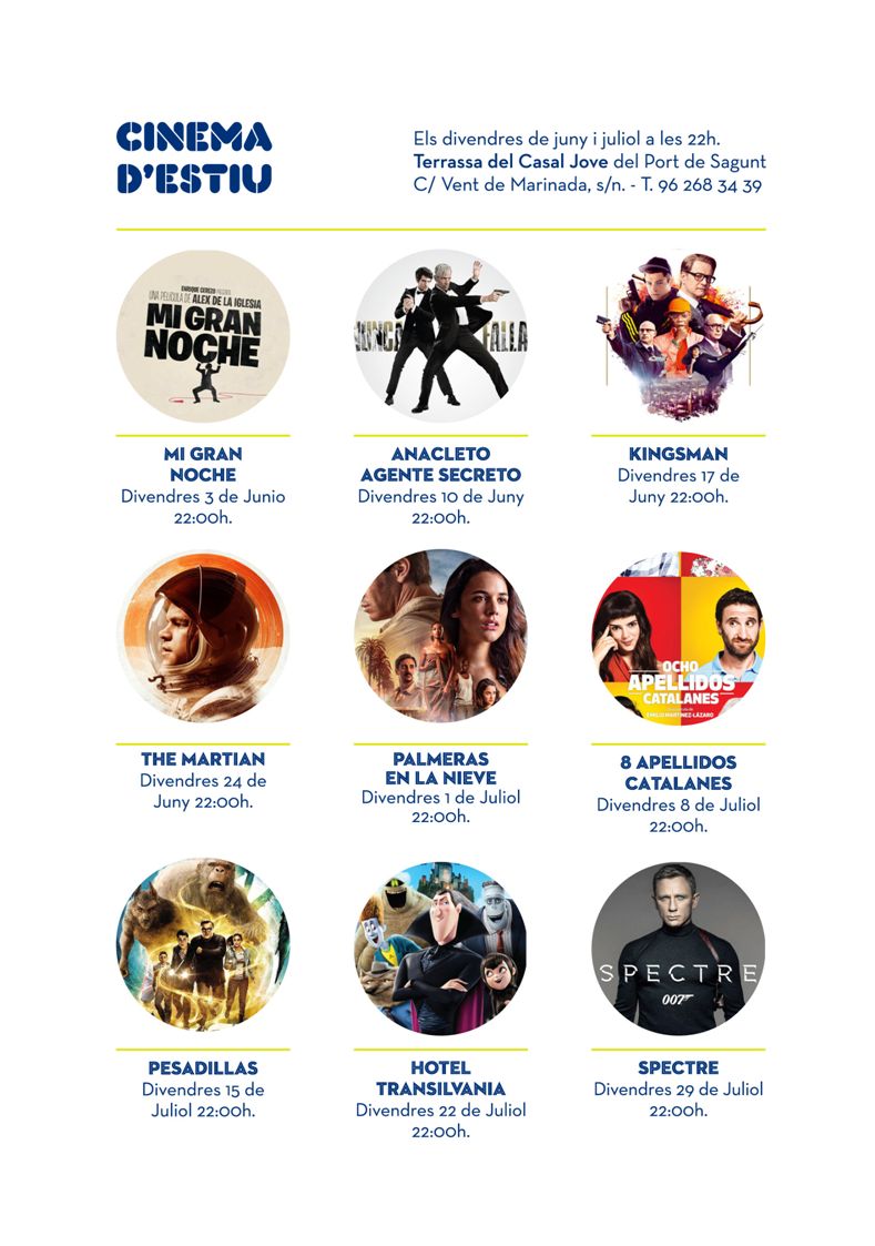 La programació comença aquest divendres, 3 de juny, amb la pel·lícula d'Alex de la Iglesia “Mi gran noche”, sempre a partir de les 22 hores, i continua el divendres, 10 de juny, amb la projecció de “Anacleto, agente secreto”, un film de Javier Ruiz Caldera basat en les històries creades per Vázquez. El divendres, 17 de juny, es projectarà la pel·lícula anglesa d'espionatge “Kingsman, servicio secreto”, mentre que el divendres, 24 de juny, s'emetrà “The Martian”, una producció de Ridley Scott guanyadora del Globus d'Or a millor pel·lícula el passat any.