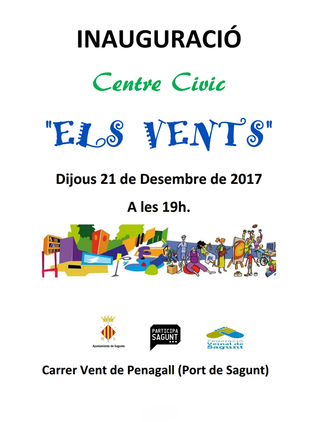 La delegació de Participació Ciutadana de l'Ajuntament de Sagunt juntament amb la Federació de Veïns inaugura el Centre Cívic ‘Els Vents’. L'acte tindrà lloc este dijous 21 de desembre, a les 19.00 hores.