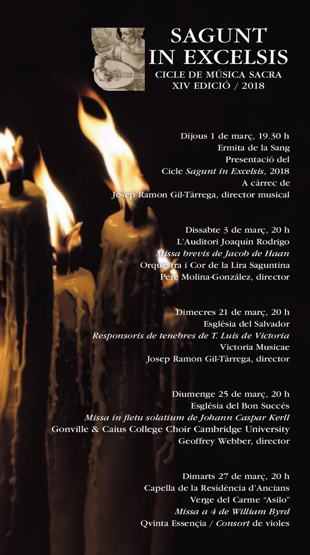A estos concerts els seguiran el dimecres 21 de març, a les 20 hores, en l'església d'El Salvador, Responsoris de tenebres de T. Luis de Victoria, Victoria Musicae, dirigit per Josep Ramon Gil-Tàrrega; el diumenge 25 de març, a les 20 hores, en l'església del Bon Succés, la Missa in fletu solatium de Johann Caspar Kerll dirigida per Geoffrey Webber; i el dimarts 27 de març, a les 20 hores, en la capella de la residència d'ancians Verge del Carme “asil” la Missa a 4 de William Byrd amb Qvinta Essençia i Consort de violes, com a tancament del cicle.
