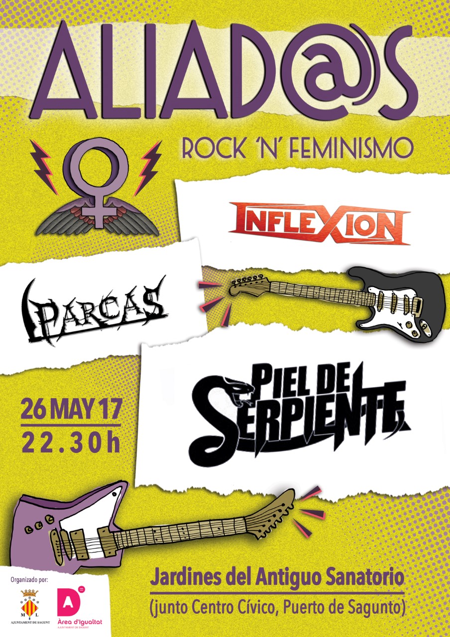 “el concert estarà format per 3 bandes de rock: dos de les quals locals “Inflexió” i “Parques”, i una valenciana, “Pell de serp”. Estos grups estan íntegrament formats per homes, ja que la intenció és trencar els tòpics que el rock és una música sexista i patriarcal, d'ací el lema: ALIAD@S, Rock ´n´Feminismo”.Cal assenyalar que les tres bandes tocaran 4 temes originals cadascuna, amb contingut feminista i/o dedicat a les dones i també 2