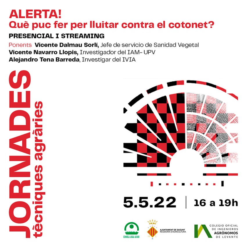 L'Ajuntament de Sagunt i el Consell Agrari de Sagunt organitzen juntament amb el Col·legi Oficial d'Enginyers Agrònoms de Llevant una jornada tècnica agrària, que se celebraran per segona vegada este dijous, 5 de maig, de 16.00 a 19.00 hores en la Sala d'actes del Consell Agrari (plaça Trinidad 2, Sagunt) i en esta ocasió estaran dedicades a la formació en la lluita contra el cotonet.