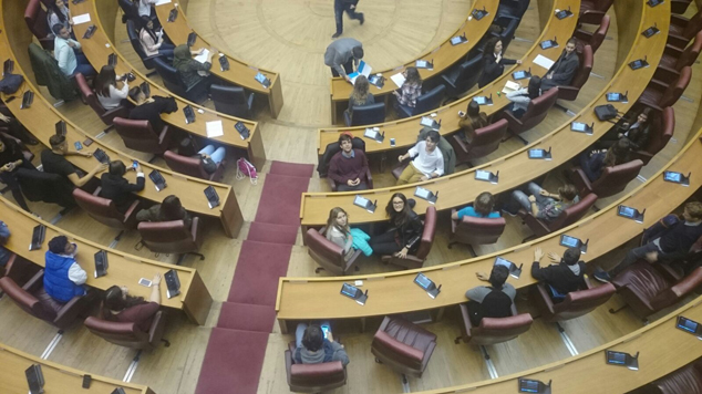 Després els joves van passar a l'hemicicle, on es van asseure i va començar la sessió amb el president i el secretari de les Corts, el president d'Unicef i representants del PSPV-PSOE, Compromís, Ciutadans i Partit Popular. Els joves van llegir els seus manifestos i propostes davant els diputats autonòmics i una vegada van acabar se'ls va lliurar un diploma i van prendre un menjar. Mireia Arona, en representació del Consell de la Infància de Sagunt, va ser l'encarregada de llegir el manifest i les propostes dels grups del nostre municipi.