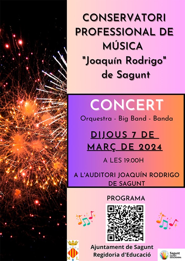 El Conservatori Professional de Música Joaquín Rodrigo de l'Ajuntament de Sagunt realitzarà hui, dilluns 4 de març, i demà, 5 de març, les audicions del segon trimestre i este dijous, 7 de març, oferirà un concert gratuït en L’Auditori Joaquín Rodrigo de Sagunt a les 19 hores, en el qual actuaran l'Orquestra, la Big Band i la Banda. Estes actuacions les organitza el Conservatori municipal dependent del departament d'Educació.