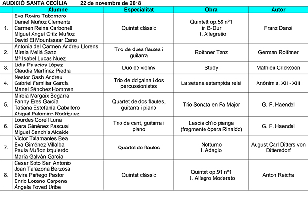 Estes audicions comptaran amb dos quintets clàssics, trio de dos flautes i guitarra, duo de violins, trio de dolçaina i dos percussionistes, quartet de dos flautes, guitarra i piano, trio de cant, guitarra i piano i un quartet de flautes. Interpretaran obres de F. Danzi, G. Roithner, M. Cricksoon, G. F. Haendel, A. C. Ditters von Dittersdorf i A. Reicha.