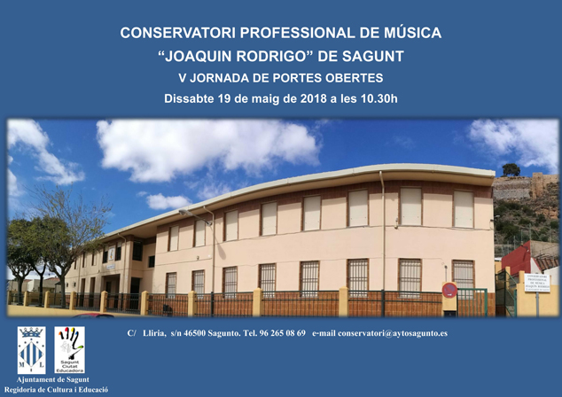 La setmana cultural, oferida pel conservatori professional de música Joaquín Rodrigo, està compresa entre el 2 i 7 de maig. Esta setmana cultural oferirà diverses activitats que tindran lloc en el conservatori, situat en el carrer Llíria de Sagunt. A més, també es realitzaran activitats al marge de la setmana cultural, els dies 10, 14 i 21 de maig. Igualment tindrà lloc la cinquena jornada de portes obertes el dissabte 19 de maig per a ensenyar el centre i explicar el seu funcionament a aquelles persones interessades a accedir-hi com a alumnes.