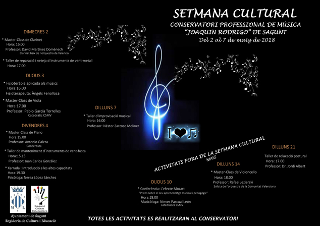 Però ací no acaben les activitats, ja que el conservatori musical Joaquín Rodrigo s'ha disposat a allargar les activitats fora de la setmana cultural. El dijous 10 de maig a les 18.00 hores, es comptarà amb una conferència denominada L'efecte Mozart, que va sobre les pistes del seu aprenentatge musical i pedagògic. La conferència serà presidida per la musicóloga Nieves Pascual León, catedràtica del CSMV. El dilluns 14 de maig s'impartirà una master-class de violoncello a les 18 hores, pel professor Rafael Jezierski (solista de l'orquestra de la Comunitat Valenciana). Per a acabar amb les activitats, el dilluns 21 de maig, a les 17.00 hores es realitzarà un taller de relaxació postural, dirigit pel professor doctor Jordi Albert.