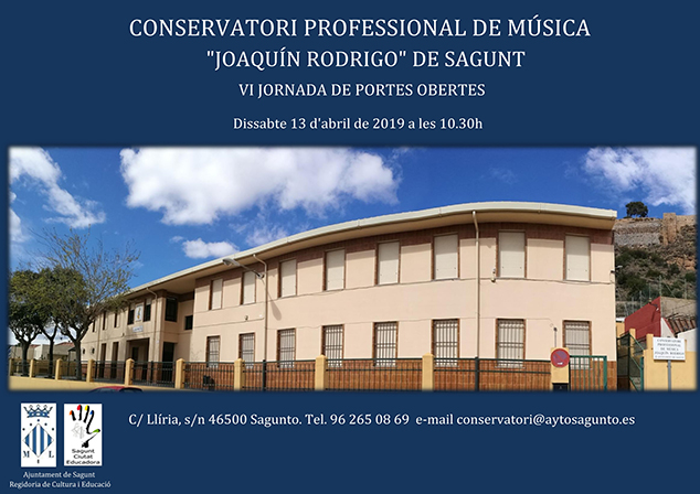 El Conservatori professional de música Joaquín Rodrigo de l'Ajuntament de Sagunt oferirà, dissabte que ve 13 d'abril, la VI Jornada de portes obertes. Des de les 10.30 hores, el conservatori estarà obert a tot el futur alumnat i acompanyants interessats en conèixer de prop el funcionament d’este centre educatiu musical.