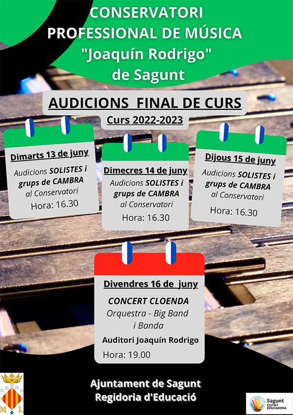 Així mateix, les audicions de final de curs de solistes i grups de cambra tindran lloc el dimarts 13, 14 i 15 de juny a les 16.30 en el Conservatori.