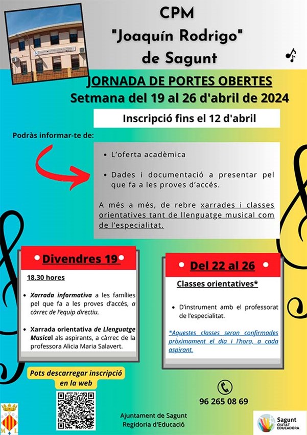 El Conservatori Professional de Música Joaquín Rodrigo de Sagunt, que depén del departament d'Educació de l'Ajuntament de Sagunt, ha preparat una setmana de portes obertes que tindrà lloc del 19 al 26 d'abril, perquè la ciutadania puga acostara i conéixer l'oferta acadèmica i les dades i documentació a presentar en les proves d'accés, a més de xarrades i classes orientatives. Les persones interessades poden inscriure's fins al 12 d'abril en la web, on hauran d'emplenar un formulari i enviar-lo a conservatori@aytosagunto.es.