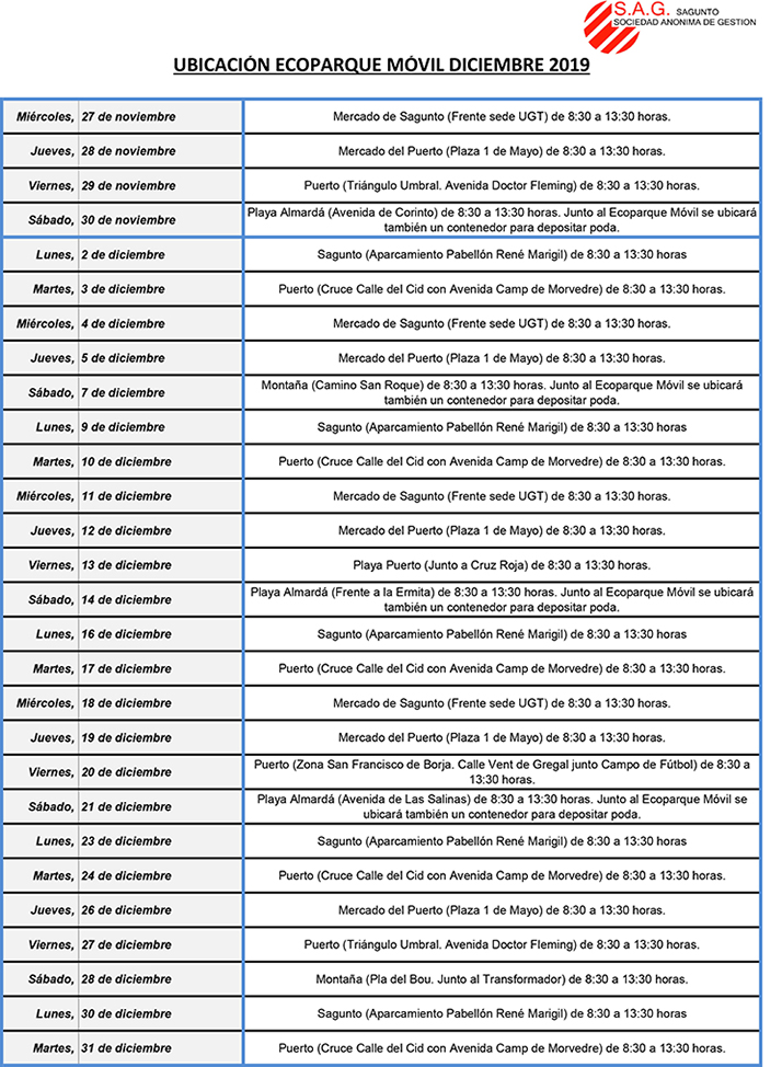 Concretament, l’ecomòbil està situat, segons els dies, en diverses zones del municipi, de 8.30 a 13.30 hores, com el mercat de Sagunt (enfront de la seu UGT), l'aparcament del Pavelló René Marigil (Sagunt), el mercat del Port de Sagunt (Plaza 1 de Maig), el Triangle Umbral, la Platja del Port de Sagunt (al costat de Creu Roja), l'encreuament del carrer del Cid amb avinguda Camp de Morvedre, al carrer Vent de Gregal i altres zones de la platja d’Almardà i urbanitzacions de muntanya. Per a més informació sobre els punts on estarà situat l’ecomòbil s'especifiquen els detalls en la imatge de baix.
