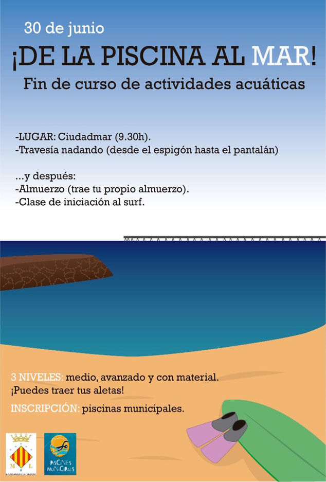 El dissabte 30 de juny es realitzarà “De la piscina a la mar!”, l'eixida de finalització de curs d'Activitats Aquàtiques de l'Ajuntament de Sagunt. L'objectiu d'este esdeveniment és nadar en el mar al llarg de la platja del Port de Sagunt des de l'espigó fins al pantalà. Es tracta d'una activitat oberta i totalment gratuïta i accessible, ja que s'organitzaran tres nivells (mitjà, avançat i amb material) per a realitzar el recorregut.