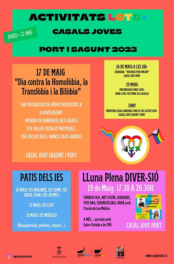Els Casals Joves de Sagunt i Port del departament de Joventut i Infància de l'Ajuntament de Sagunt han organitzat activitats LGTB+ amb la finalitat de promoure la diversitat i la inclusió, així com donar suport a esta comunitat, que tindran lloc al maig i juny i es dirigixen als jóvens de més de 12 anys.