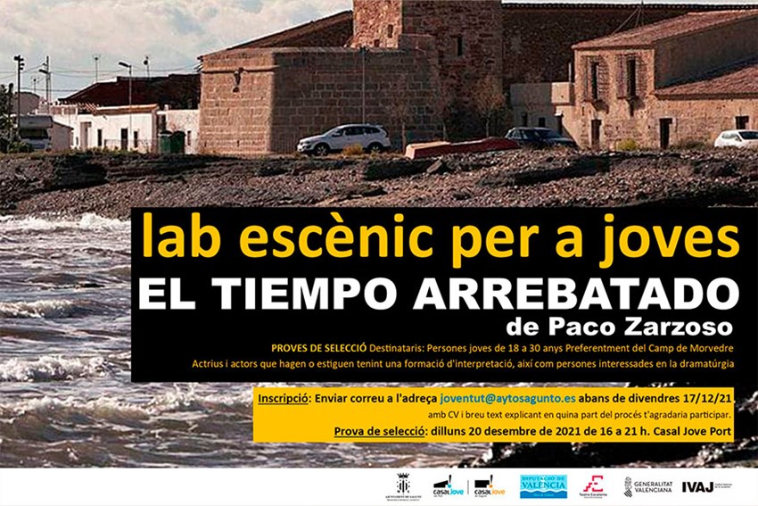 La Regidoria de Joventut i Infància de l'Ajuntament de Sagunt, dins del seu Programa Cultura Jove, torna a posar en marxa dos laboratoris creatius, un dedicat a les arts escèniques, davall la direcció de Paco Zarzoso i un altre de caràcter audiovisual dirigit per Vic Pereiró. En tots dos es procedirà a una selecció d'actors, actrius i projectes, amb els quals en format de taller es treballarà durant el primer semestre de 2022. Estes dos iniciatives van dirigides a creadors i creadores del Camp de Morvedre menors de 30 anys. L'activitat és completament gratuïta.
