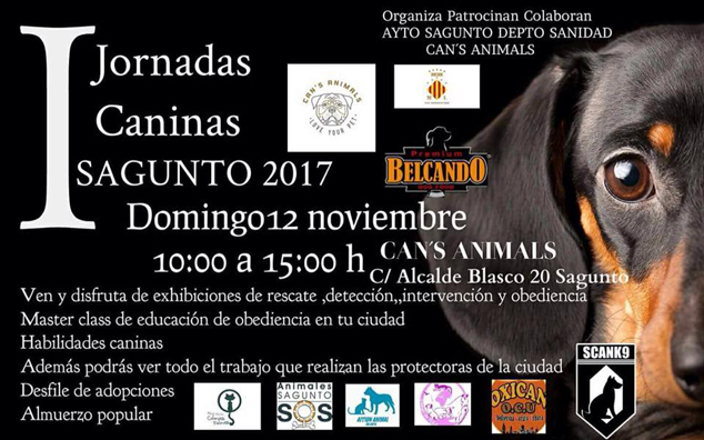 El pròxim diumenge, 12 de novembre, tindran lloc les I Jornades Canines de Sagunt, en les quals es duran a terme exhibicions de rescat, detecció, intervenció i obediència. Les activitats es realitzaran en una plaça situada al costat del riu a l'altura del carrer Alcalde Blasco, número 20 (https://goo.gl/tujyb2). A més, es comptarà amb la participació d'algunes de les protectores d'animals de la nostra ciutat com ara Colonias Felinas, El Refugio de Tula i SOS Sagunto.