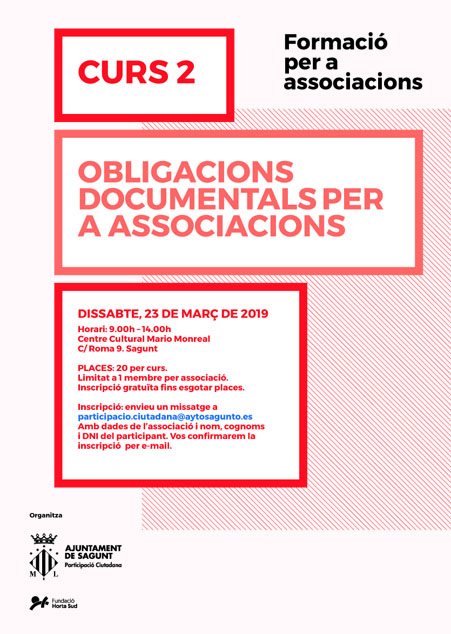 El segon curs programat és '‘Obligacions documentals per a associacions’, que serà el 23 de març en horari de 9 a 14 hores. Per al 6 d'abril està previst el curs ‘Incrementar la base social i la participació en les nostres entitats’, que serà de 9 a 13 hores (este curs, a excepció de la resta, serà en el Centre Cívic ‘Els Vents’). El curs ‘Obligacions fiscals per a associacions’ serà el dissabte 13 d'abril en horari de 9 a 14 hores, també en el Centre Cultural Mario Monreal, igual que el de ‘Creació i gestió de Blogs per a associacions’, que serà el dissabte 8 de juny de 9 a 13 hores.
