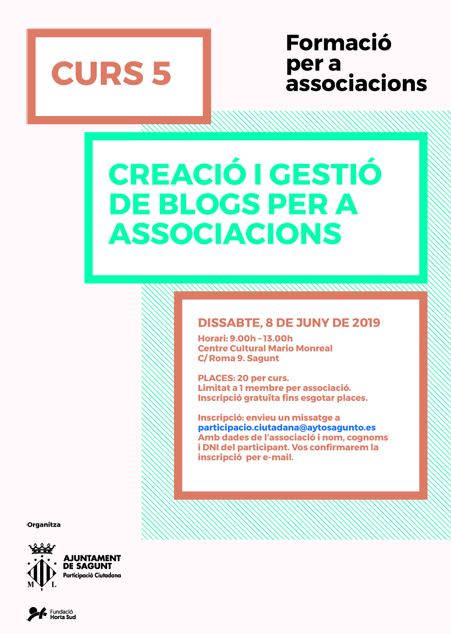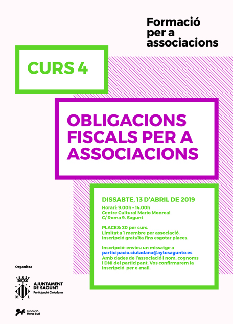 Les associacions interessades en algun d'estos cursos hauran de realitzar la inscripció a través del correu electrònic participacio.ciutadana@aytosagunto.es o r.escoms@aytosagunto.es indicant el nom de l'associació, el CIF, el nom i cognoms de la persona que assistirà en representació de l'associació, així com el seu DNI i càrrec en l'associació. Una vegada emplenat i enviat el correu se li confirmarà l'admissió al curs en cas que queden places. Els cursos estan limitats a 20 places i podrà anar una persona per cada associació.