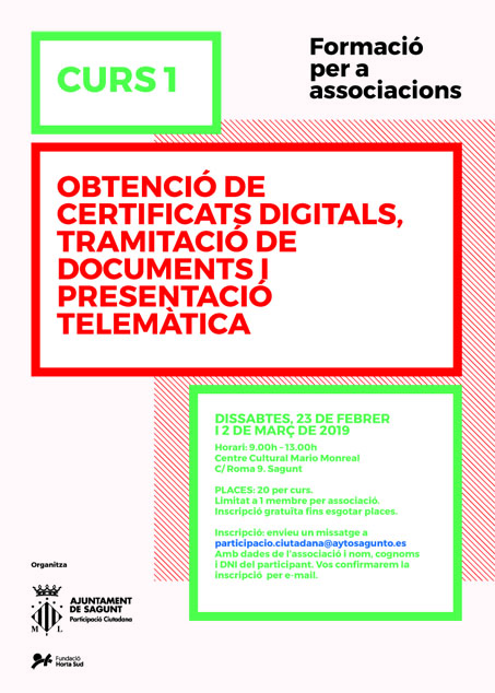 El curs formatiu per a associacions ‘Obtenció de certificats digitals, tramitació de documents i presentació telemàtica’ s'impartirà este dissabte, 2 de març, de 9 a 13 hores en el Centre Cultural Mario Monreal de Sagunt.
