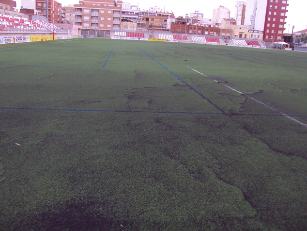 La instal·lació de la gespa artificial del camp del Fornàs ha fet deu anys. Segons s'exposa en l'informe, es va instal·lar una gespa de dubtosa qualitat, una mala instal·lació i un drenatge insuficient. Actualment cap part del terreny supera els 2 cm. de farcit, i en alguns casos menys d'1 cm., per la qual cosa es pot considerar que el camp no és apte per a la pràctica esportiva intensiva. En l'estat en el qual es troba no superaria l'absorció del xoc que garantisca la seguretat del jugador i podria provocar lesions.