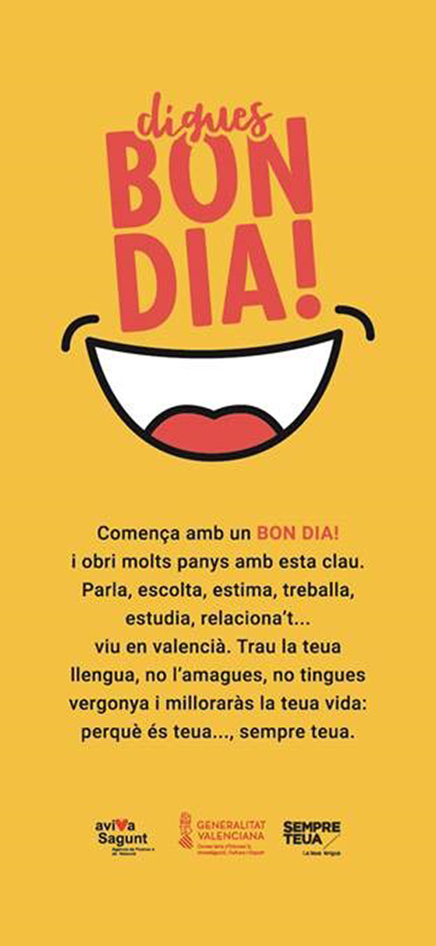 El Gabinet de Promoció del Valencià de l’Ajuntament de Sagunt ha presentat la campanya de sensibilització de la llengua Digues Bon Dia! que tracta de convidar a iniciar una conversa en valencià mitjançant un missatge senzill i directe com és dir bon dia. La campanya consta de diversos materials que es distribuiran massivament al carrer i en contextos concrets, com ara adhesius, xapes, bosses de tela multiusos i blocs de notes adhesives. A més, en els principals edificis municipals s’exposaran permanentment unes lones amb el lema de la campanya i pantalles enrotllables que invitaran la ciutadania a traure la llengua.