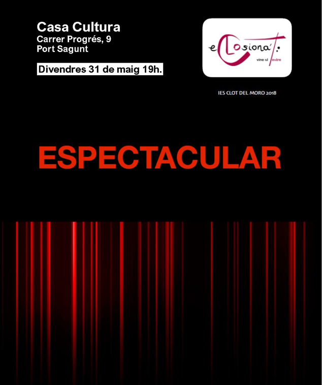 Divendres que ve 31 de maig, a les 19 h la Casa Municipal de Cultura del Port de Sagunt acull l'obra teatral Espectacular, representada pel grup de teatre de l’IES Clot del Moro. L'obra teatral forma part de la campanya “eCLOsiona’T: vine al teatre” realitzada amb la col·laboració de la delegació de Joventut de l'Ajuntament de Sagunt. Les entrades de l'espectacle són gratuïtes i s'han de reservar fins a les 21 h de demà, dijous 30 de maig, cridant al Casal Jove, a través del telèfon: 96 268 34 39.