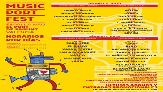 Els dies 6 i 7 de Juliol el Music Port Fest es realitzarà a l'entorn de la Nau del Port de Sagunt (al costat de l‘Alucine). I ho farà amb referències estatals com Kase.O, Mala Rodríguez, Corizonas o Sexy Sadie. També comptarà amb una presència important de bandes autòctones com Smoking Souls, El Diluvi, La Plata o Candela Roots. Juntament amb les actuacions dels artistes es realitzaràn també actuacions de teatre.