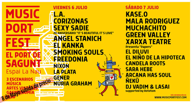 El Music Port Fest, el acontecimiento musical que se celebrará en el entorno de La Nave de Puerto de Sagunto, se celebrará los días 6 y 7 de julio. Esta iniciativa se enmarca dentro de las acciones culturales destinadas a revitalizar y dinamizar la zona industrial de la localidad del Camp de Morvedre, además de formar parte de los actos de la Capitalidad Cultural Valenciana de Sagunto a lo largo del 2018. Un festival, que contará con 3 escenarios, y que además de conciertos, acogerá propuestas artísticas y escénicas de vanguardia. Proyecto nacido con el esfuerzo conjunto de las promotoras valencianas: El Caimán Producciones, Metrónomo y Sagarmanta junto con la colaboración del Ayuntamiento de Sagunto, la Agencia Valenciana de Turismo y Turismo Valencia (Diputación de Valencia).