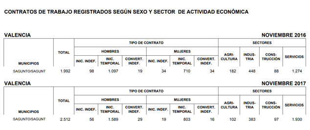 Quant als contractes de treball registrats en el mes de novembre, la xifra aconseguix els 2.512 contractes, la qual cosa suposa un augment de 520 contractes respecte a l'any anterior, en el qual el mes de novembre es va tancar amb 1.992 contractes. Les últimes dades de contractes registrats el passat mes indiquen que 1.674 han anat destinats a hómens (56 contractes inicialment indefinits, 1.589 temporals i 29 convertits a indefinits), mentre que 838 han sigut para dones (19 contractes inicialment indefinits, 803 temporals i 16 convertits a indefinits).