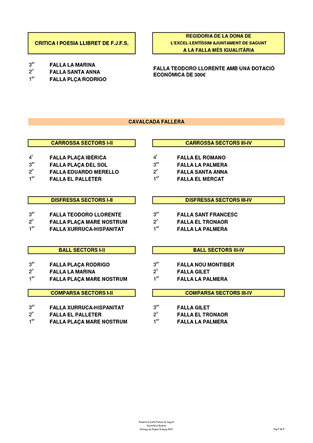 En secció primera, la falla Luis Cendoya ha aconseguit el primer premi, a més del de Millor Pintura i Enginy i Gràcia; seguit de la Palmereta, Santa Anna i Els Vents. En categoria infantil, la falla Luis Cendoya va aconseguir també el primer premi i el d'Enginy i Gràcia. El premi a Millor Pintura va ser per a El Tronaor, que també es va emportar el segon premi. El tercer va ser per a l'Eduardo Merello.