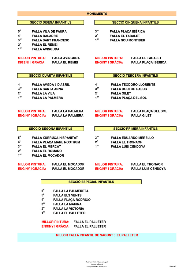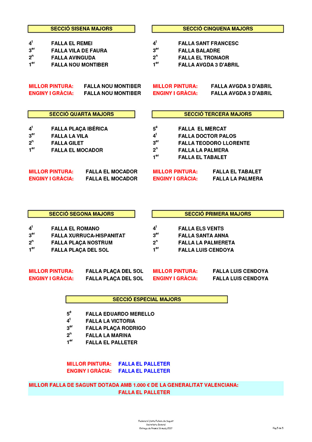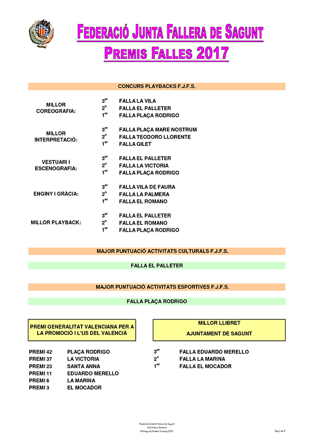 El lliurament de premis de les falles 2017 que ha tingut lloc esta vesprada en les portes de l'Ajuntament de Sagunt va culminar amb la victòria de la falla El Palleter tant en el monument gran com en l'infantil. El jurat va atorgar al Palleter el primer premi en la Secció Especial per tercer any consecutiu, a més del de Millor Pintura i el d'Enginy i Gràcia. De manera que El Palleter es va imposar al monument de la falla La Marina que va aconseguir el segon premi. El tercer lloc va ser per a la falla Plaça Rodrigo. Per la seua banda el quart i cinquè van ser per a les falles La Victoria i Eduardo Merello, respectivament.