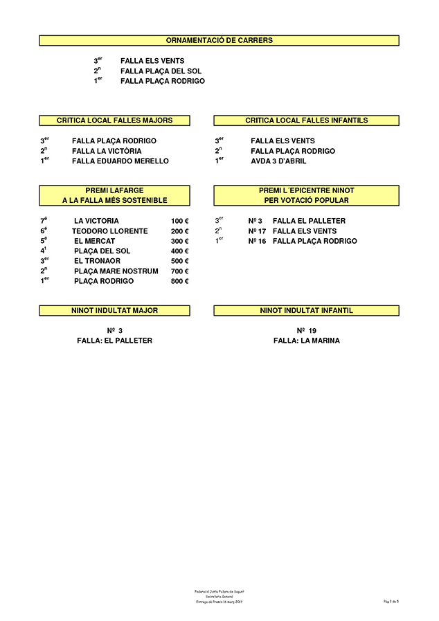Finalment, Lafarge va atorgar el primer premi de la Falla més sostenible a la falla Plaça Rodrigo, mentre que el segon i tercer premi van ser per a la Mare Nostrum i El Tronaor, respectivament. El premi de L’Epicentre al ninot indultat per votació popular va ser per a Plaça Rodrigo, seguida de Els Vents i la falla El Palleter.