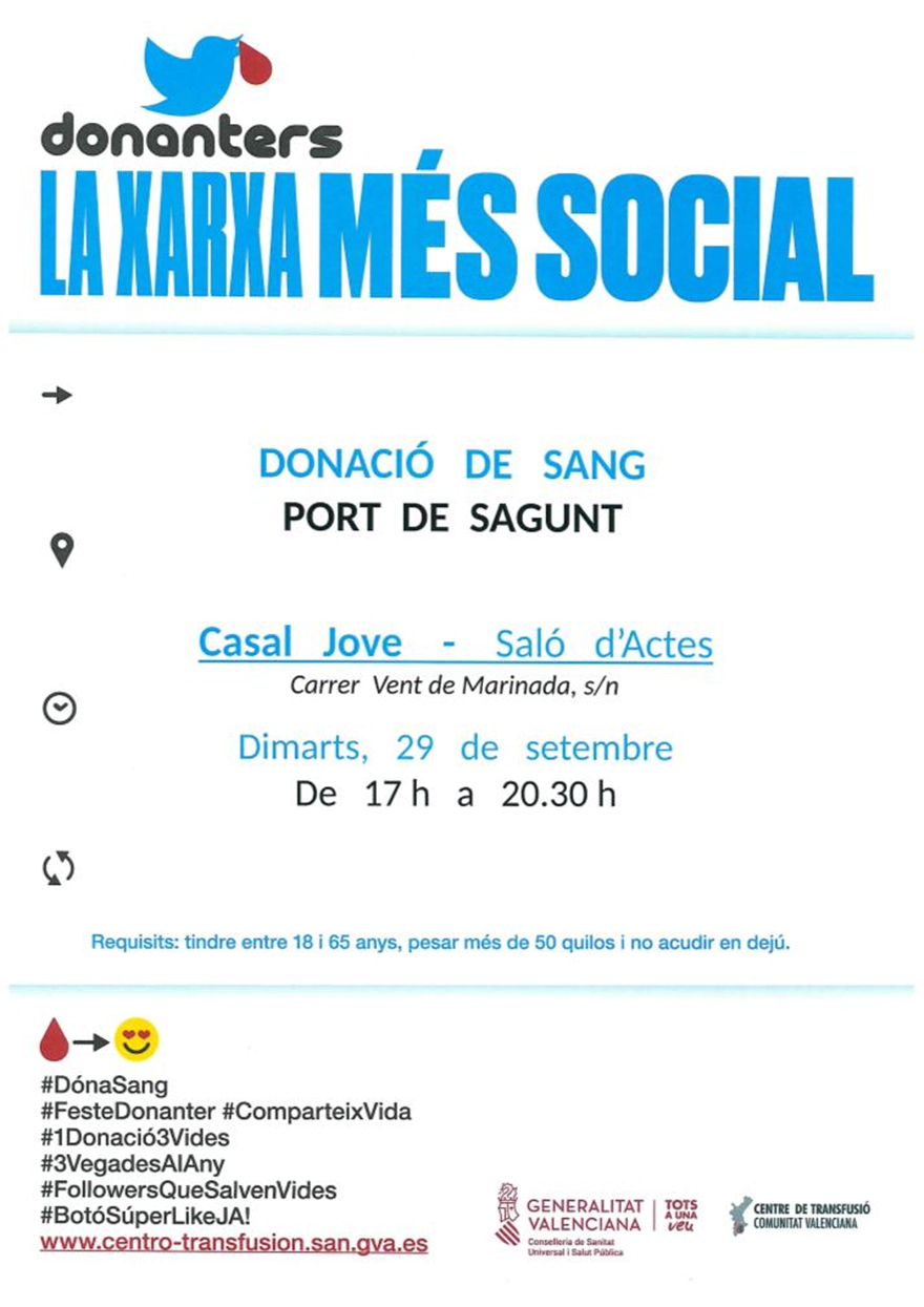 El Port de Sagunt acull de nou la campanya ‘Donanters. La xarxa més social’, que està duent a terme el Centre de Transfusió de la Comunitat Valenciana al llarg de la geografia valenciana. La ciutadania que desitge donar sang podrà fer-ho demà, dimarts 29 de setembre, en el Casal Jove de 17 a 20.30 hores.