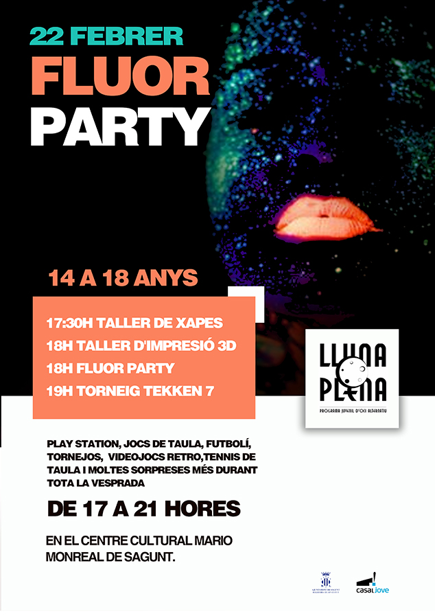 El programa d’oci alternatiu Lluna Plena, que es du a terme des de 2013, ha organitzat una “Fluor Party” per a adolescents a Sagunt. És una iniciativa d’un grup d’adolescents del municipi on hi haurà tallers de creació de xapes, impressió 3D, una festa a fosques amb pintura fluorescent o “Fluor Party” i tornejos de videojocs. Estos tallers estan pensats per a adolescents de 14 a 18 anys i es realitzarà el pròxim divendres, 22 de febrer, de 17 a 21 hores en el Centre Cultural Mario Monreal de Sagunt.